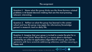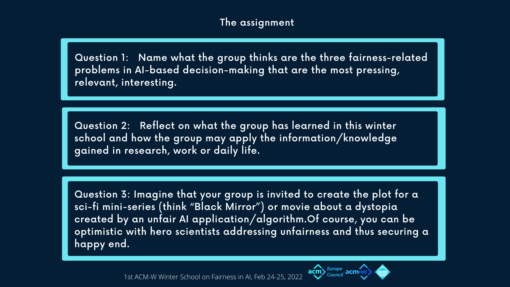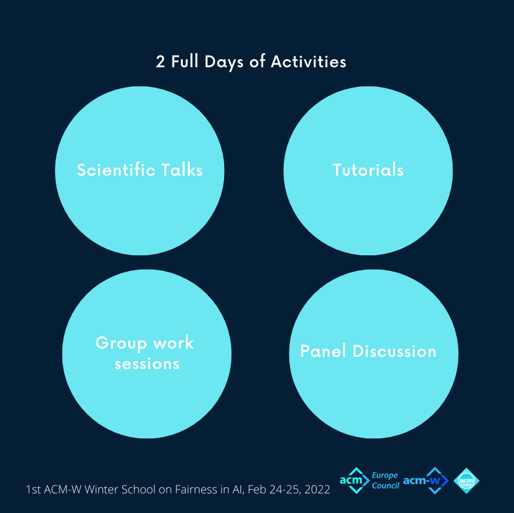 The inaugural edition of the Greek ACM-W Chapter Winter School (GECSW22) took place online on February 24-25, 2022. Living the revolution of AI, with issues of biased treatments, exclusion, and unfairness being raised, the topic could not be anything else than “Fairness in AI”. Participation was free but limited to facilitate interactions. After the selection process, more than 60 participants from more than 20 countries had the opportunity to be part of the