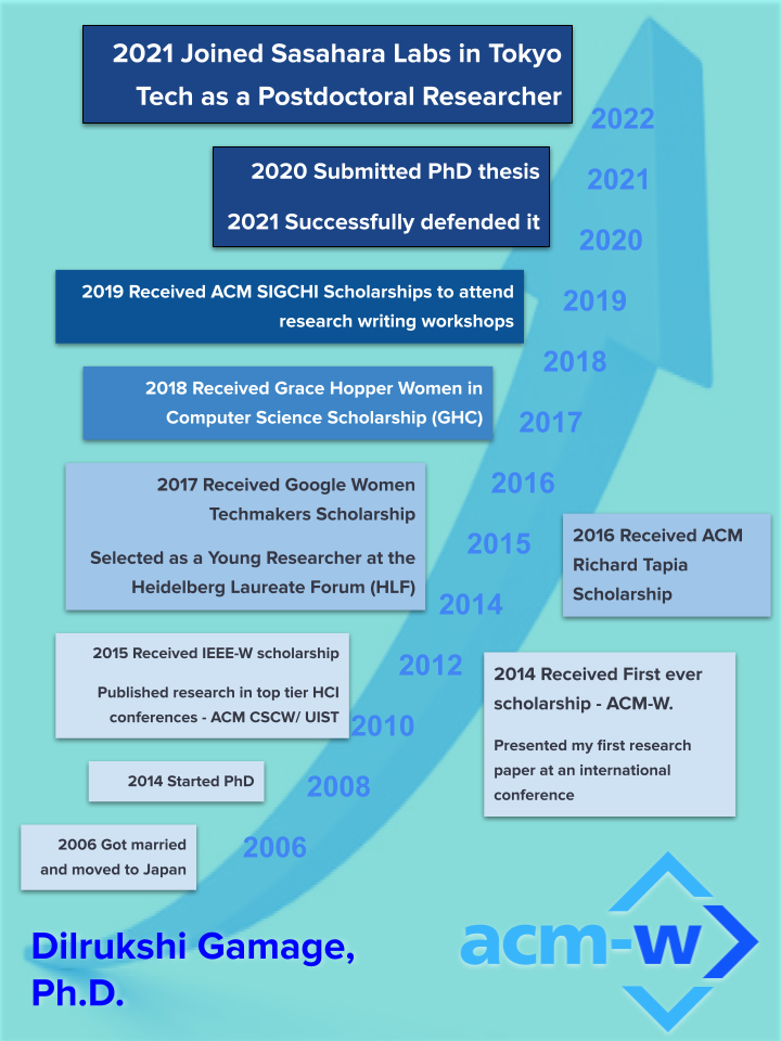 It was my first ever scholarship. Pursuing my PhD.in Sri Lanka, I thought I would never be able to travel and take part in any of my dream conferences. But ACW-W made my dream come true; it was my first conference as a PhD student, and I made a lot of connections through the conference. Thereafter, I received many other scholarships, but receiving that first, as breaking the ice is much harder. I am so thankful for the ACM-W recognition and the value and opportunity given to underrepresented women in tech.