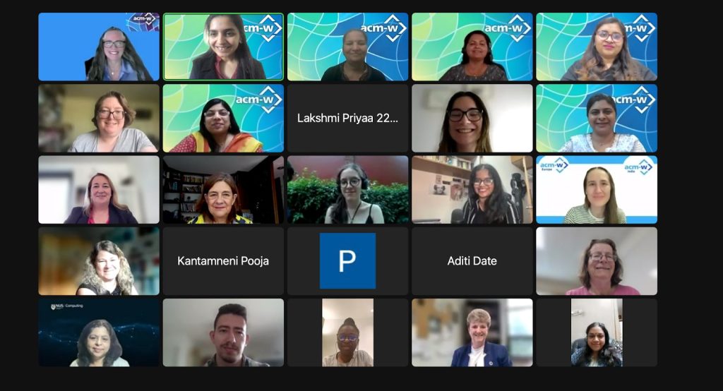The event began with a welcome address by Arati Dixit (Chair, ACM-W Regional Activities Committee), followed by ACM-W Global Chair Ruth Lennon’s address to the audience. The chapter presentations commenced with the ACM-W Europe region, and Dorota Filipczuk spoke about ACM-W Europe. Then, we heard presentations from ACM-W Europe Chapter Kiel, ACM-W Chapter – Annika Huch, and UPV ACM-W Student Chapter – Laura Jiménez Navarro.