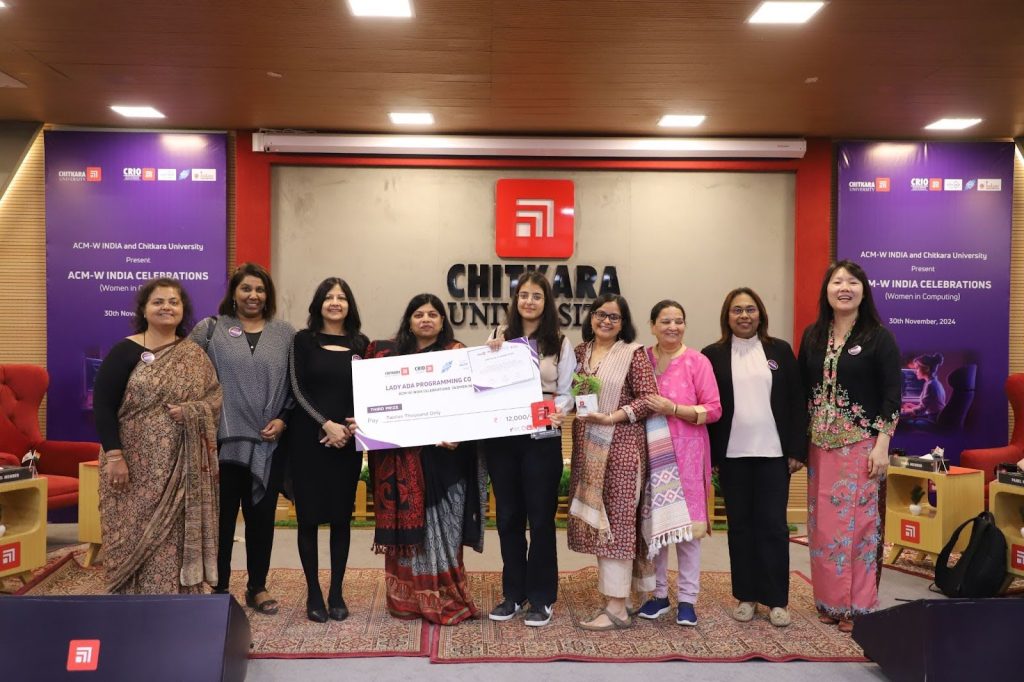 One of the main highlights of the celebration was the final round of the Lady Ada Programming competition. ACM India-W annually hosts the Lady Ada Programming Contest for female students (enrolled in undergraduate and masters level CS/IT courses). This coding contest acts as a platform to develop and showcase coding talent, empowering young female techies across India. The competition creates opportunities and encourages female students to explore, enhance, and expand their coding skills. This edition of the contest witnessed enthusiastic participation from over 1200 contestants across India. The top ten 10 finalist girls were given sponsorships to travel and participate in the final round at Chitkara University. The final round winners were awarded with trophies and cash prizes.