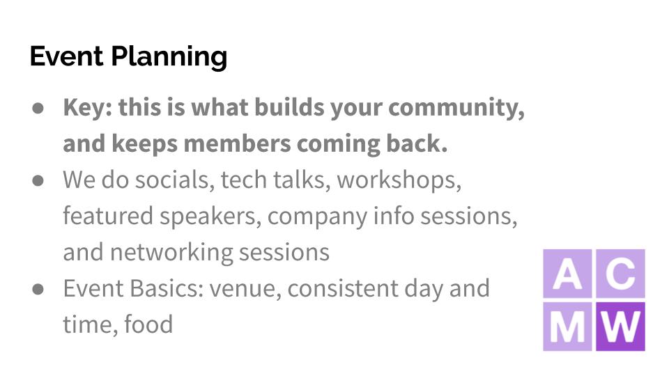 In this segment, ACM-W OSU Chapter Officer, Laura, talks about planning effective events for your club. She says that the best way to grow your club and your community is through events. Consider hosting a back-to-school social at the start of the semester, tech talks with professors, and networking events with company recruiters. To plan your event, think about these three event basics: your venue, menu and calendar.