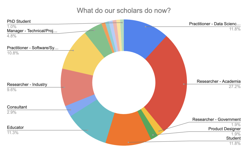 A large percentage of our scholars continued their journey as researchers in academia, followed by practitioners in software, systems, and hardware and researchers in industry. They make up 62% of the respondents; we do also see a diversity of roles ranging from consultants to entrepreneurs.